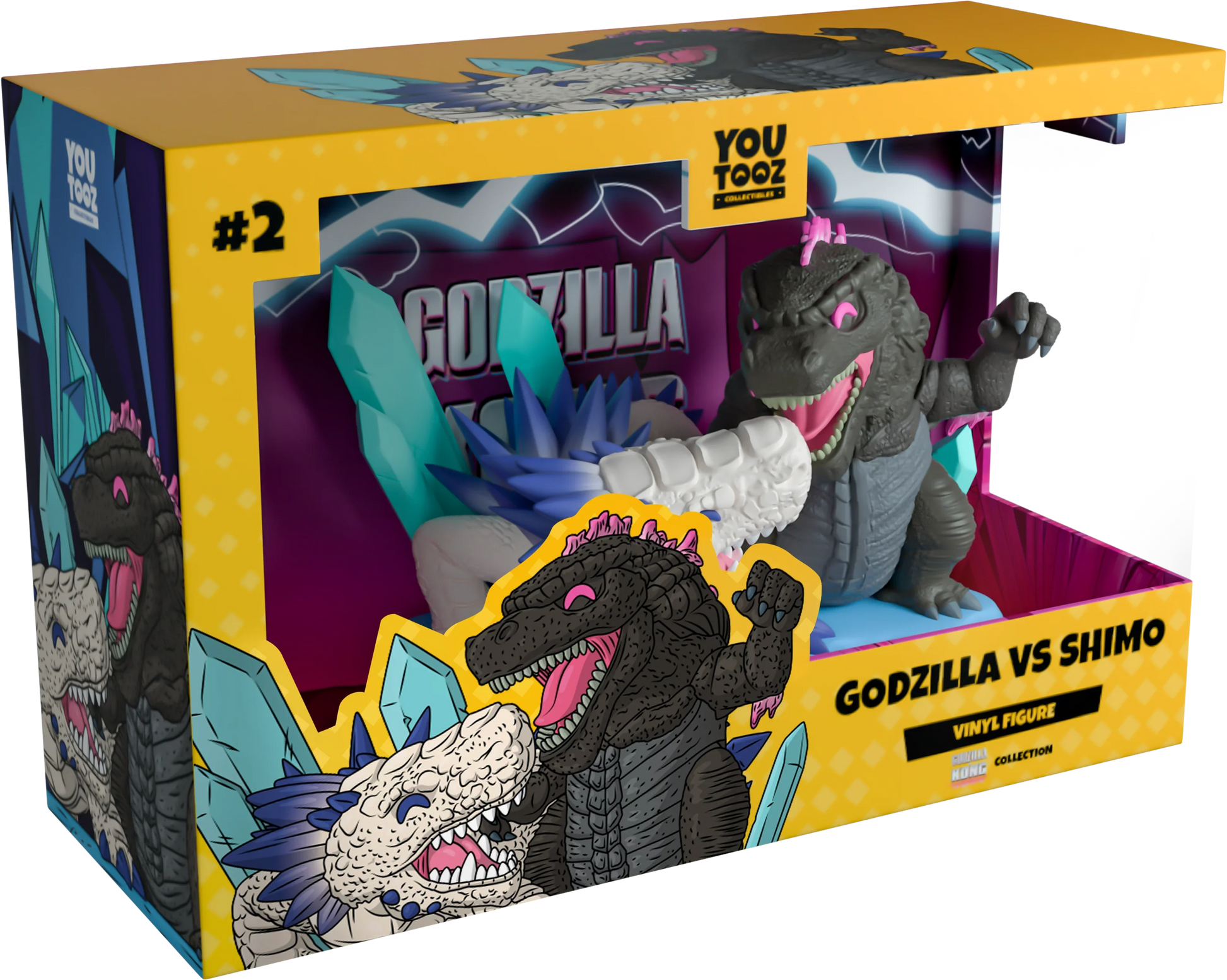 Godzilla and Shimo have brought their fight to Youtooz, better take cover! At 3.6 inches tall and set amongst a backdrop of sharp turquoise crystals that rise from the cold icy ground, Godzilla unleashes a devastating roar as he raises a sharp clawed hand upwards and readies to strike out with the deadliest blow. While Shimo, on all fours, curls around him with a snapping white scaled face looking upwards as long dark blue spines extend out from her neck and run down her back onto a lethal pronged tail. The exterior of their packaging sees Godzilla and Shimo mid battle amongst a sea of icy blue crystals. While the interior is a glowing pink cave filled with sharp clusters of crystals jutting out from the ground as bright white lightning shoots across the ceiling, this then continues onto the protective sleeve where their figures can be seen through the large clear window at the packaging’s front. This collectible ships in a matte, embossed, protective outer sleeve and a custom sized plastic protector for maximum protection during shipping.
