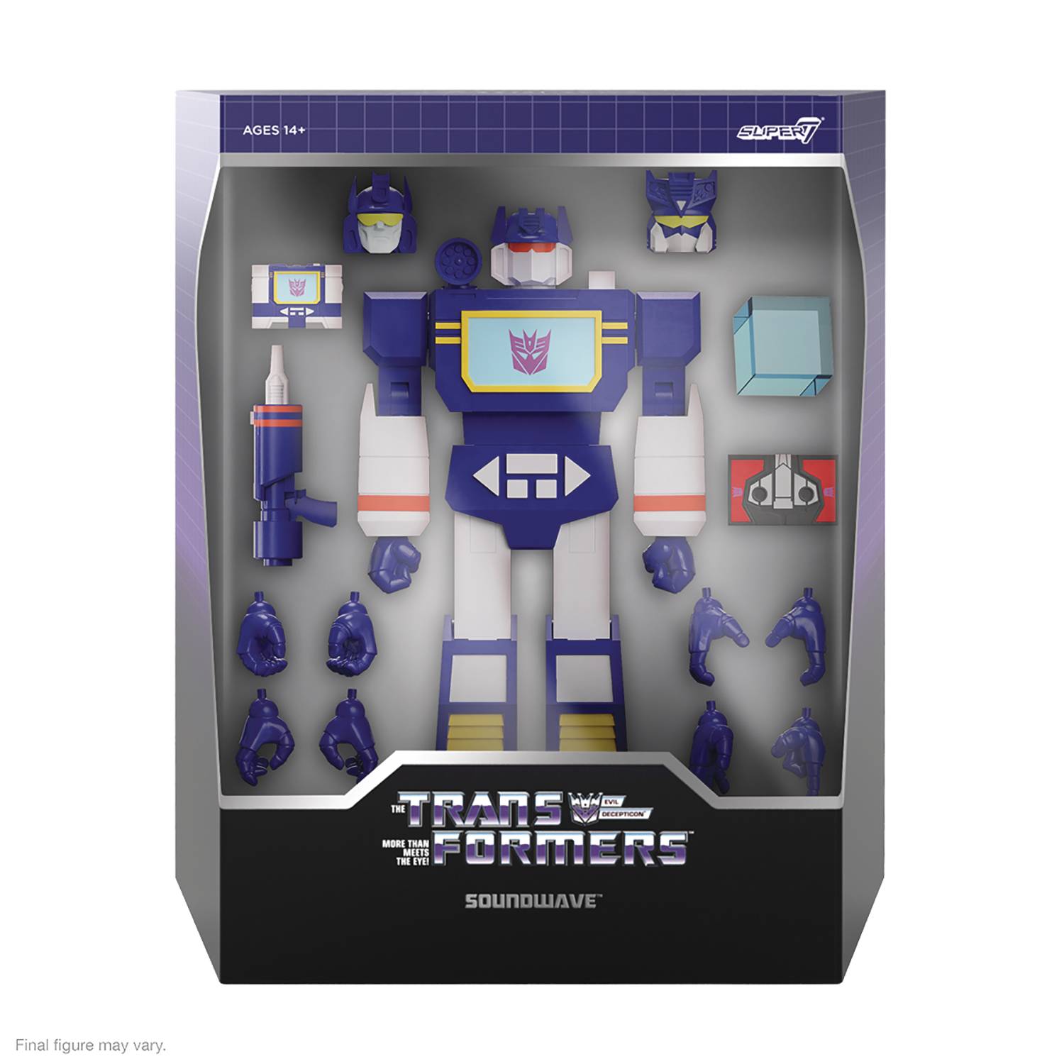 From Super7. The Decepticon spymaster Soundwave rarely has much to say, but his daunting presence and loyalty to Megatron is unquestionable! This 7" scale highly articulated Transformers ULTIMATES! figure of Soundwave depicts his original G1 cassette recorder-based robot form and features cassette storage in his front chest along with backpack battery storage.